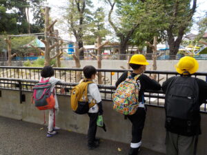 電車に乗って、井の頭自然文化園に行きました。ICカードを使う機会が増えている中、自分で切符を買うのは初めてという子どももいました。一人ずつドキドキした表情で券売機を操作し、切符が出てくると嬉しそうにしていました。井の頭自然文化園では、スポーツランドで乗り物に乗ったり、動物を見たりしました。A組仲よし学級の1~6年生みんなで楽しく活動することができました。