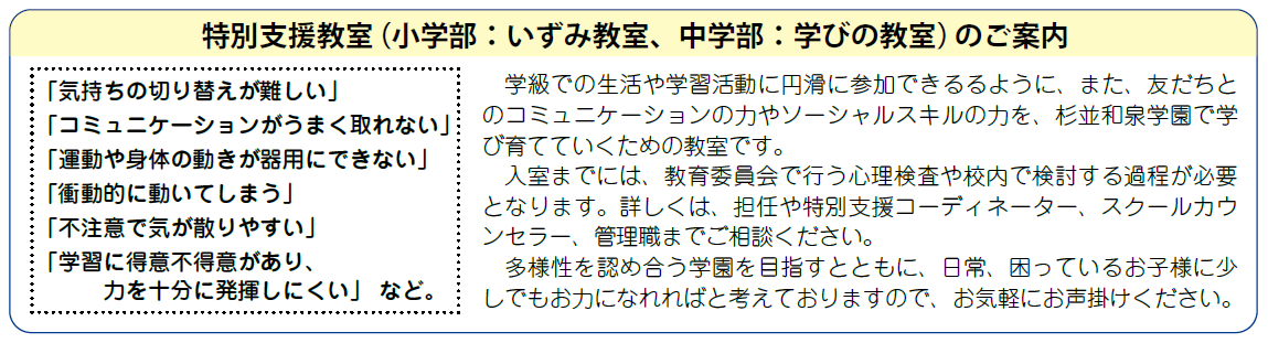 - 特別支援教室(小学部「いずみ教室」、中学部「学びの教室」)