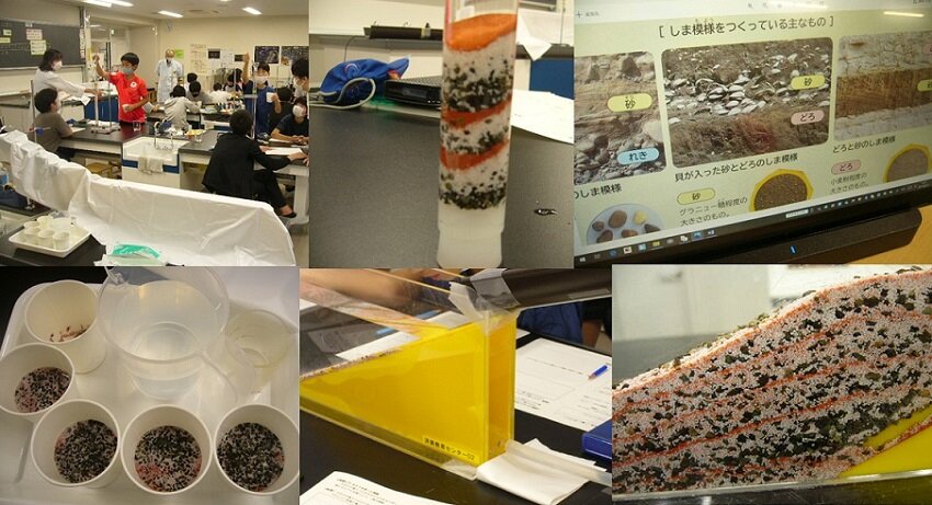 済美教育センターの出前授業で6年生がお世話になりました。みんなもよく知っている地層ですが、あのような層はどうやってできるのでしょうか。実験から調べていきます。黒い粒(レキ)、白い砂、赤い泥という粒の大きさの違う3種類を混ぜたものをパイプの水の中に入れていきます。これを3回繰り返し、粒の大きさの違いによる沈み方やつもり方について調べていきます。次に実際の川のように、トイをつかった川のモデルでも同じように行っていきます。結果は下の写真のようになりました。この実験結果から地層のでき方について考えていきます。