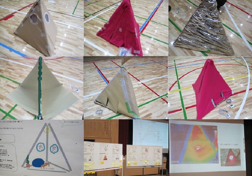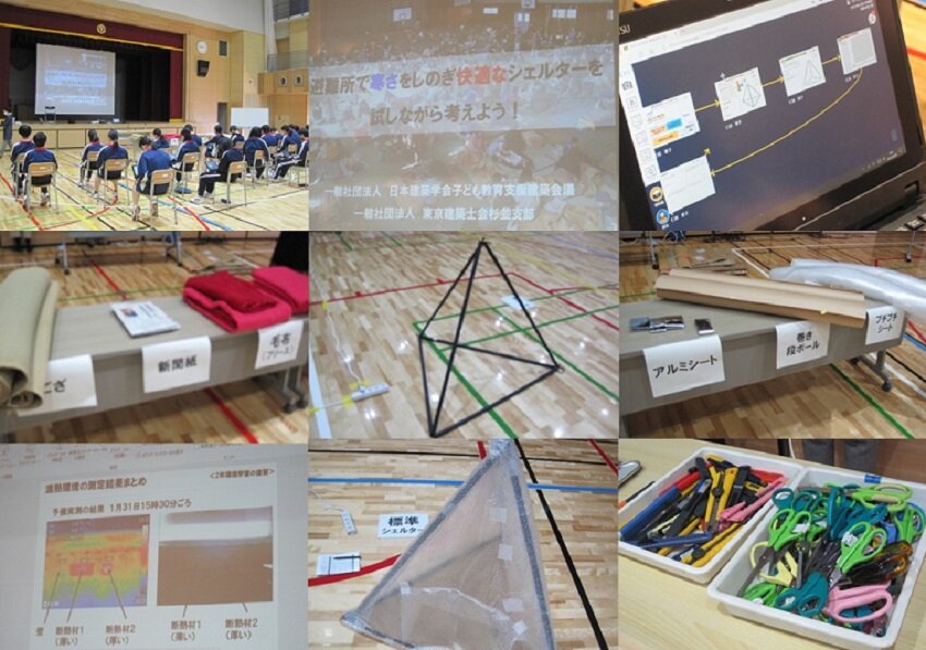3年生から始まり、毎年様々なテーマに取り組んできました。その環境学習の最終回が「シェルター」の制作です。東日本大震災から11年、発災時9年生は小さかったのですが覚えているでしょうか。寒い時期に寒い地域で起こった震災。東京でもかなり揺れ、鉄道なども止まり、高円寺中学校にも多くの人々が避難したといいます。被災地では寒い中での避難所生活が始まりました。ライフラインの途絶えた中、いかに寒さをしのぐかは大きな課題でもあります。今日は与えられた条件下でいかにあたたかなシェルターを作ることができるか挑戦します。
