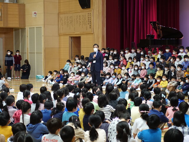 新1年生は、大アリーナの舞台前に設置されたひな壇に整列した後、2年生から昨年育てた朝顔の種をプレゼントしてもらったり、6年生からのお話をいただいたりしました。