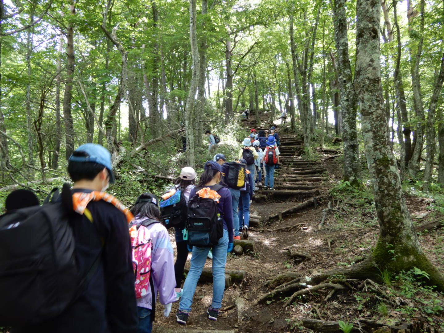 小鳥や蝉の鳴く登山道をガイドさんの案内で元気よく登りました。