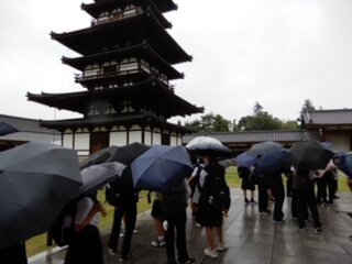 その後、訪れた薬師寺では、雨が降ってきましたが、お坊さんの楽しい講話を聞いた後、国宝の国宝・薬師三尊像や東塔などを拝観しました。雨の降る、しっとりとした薬師寺もなかなか風情がありました。