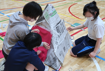 環境学習の一環として行ったワークショップでしたが、高円寺のまちに大きな災害が起き、本学園の大アリーナが避難所となったという想定で、家族が「寒さをしのげるシェルター」「心と体がリラックスできるシェルター」を考え、設営するというワークショップであったので、防災教育という意味でも価値ある学習でした。もちろん、断熱の効いた暖かなシェルター環境を、暖房機を用いることのない省エネを条件に考えるという意味で環境学習(教育)であることは間違いありません。その大切さが分かっているのか、A組、B組、D組の9年生はとても真剣に、そして積極的にワークショップに参加していました。