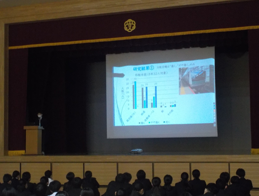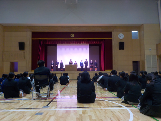 生徒会朝会では、生徒会長、各委員会の委員長により、本年度後期の活動報告等が行われました。報告の中では、単に何を行ったかについて述べるのではなく、その活動から得た成果や課題、次年度に行うべき、課題解決方法等がまとめられていました。皆、堂々とした態度で発表しており「さすが委員長!」と声援を送りたくなってしまいました。