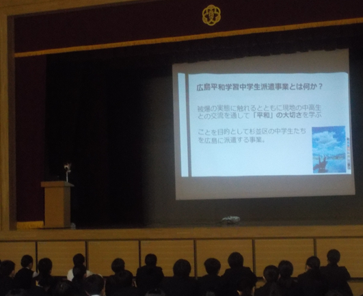 生徒会朝会の後は、8月5日(金)から7日(日)に実施された「広島平和学習中学生派遣事業」と8月12日(金)から8月21日(日)に実施された「杉並区中学生海外留学(第10期)」の校内成果報告会を行いました。