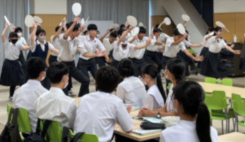 今回の交流は、多目的室で歓迎のセレモニーを行った後、それぞれの学校の様子や地域貢献活動等をプレゼンし、飯豊中学校は自慢の合唱を、本学園からは伝統の阿波おどりを披露し合いました。そして、グループに分かれて自己紹介等をし合った後、校舎内を案内して廻りました。