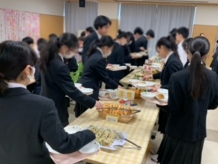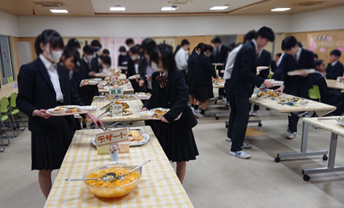 3月14日木曜日、本日の午前、9年生が卒業式予行練習後、多目的ランチルームで「卒業お祝いバイキング給食」を食べました。児童・生徒にとって、多目的ランチルーム使ってバイキング給食を食べることは、本学園開園以来、初めての試みとなります。新型コロナウイルス感染症の流行期間中に6、7、8年生であった9年生にとっても、勿論、初めての経験であり、朝からわくわくした気持ちで給食の時間を待ちわびていました。バイキング給食の実施にあたっては、給食室の調理スタッフだけではなく、事務主事さんたちも壁面の飾り付けや配膳の準備など、巣立ちゆく9年生のためにお手伝いいただきました。