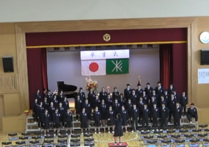 そして、卒業生代表からは「別れのことば」として、3年間の思い出、下級生へのメッセージ、友達や教職員、地域の方々、お家の人への感謝の気持ちと地域に貢献できる人となる旨の決意表明等が伝えられました。「今日を境に私たちは新しい道を切り開き、一歩、一歩、自分たちの足で歩んでいかなければなりません。歩む道はみんなバラバラです。しかし、気持ちはみな一緒だと思います。」というくだりでは、沢山の生徒たちが目頭を押さえていました。