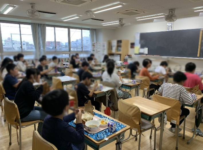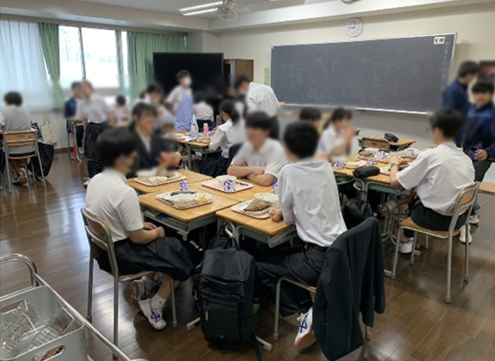 各学年の給食時間の様子を見て回ってみましたが、皆、楽しそうに食べていました。小学部で出されている中華ちまきの大きさと中学部の大きさを比べてみるとやはり中学部の中華ちまきの大きさの方が少し大きいようです。1年生のある児童が、中華ちまきを見て、「バナナの皮に包れているのかな?」と言っていました。初めて見たのかもしれません。高学年の児童で、中華ちまきがチャーハンを竹の皮で包んでいると思っている児童もいました。一つずつ、生のもち米を具材と一緒に巻き、蒸して作ってくれている事を伝えたら驚いていました。