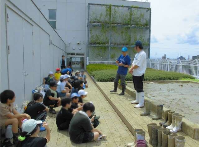 5月30日木曜日、5、6校時、5年生がJA山形おきたま飯豊地区青年部の方のご指導で、5階テラスにある「田んぼ」で田植えをしました。高層ビル街をバックに、皆「泥んこになって」「一生懸命に」そして「楽しそうに」植えている姿は素敵な光景でした。
