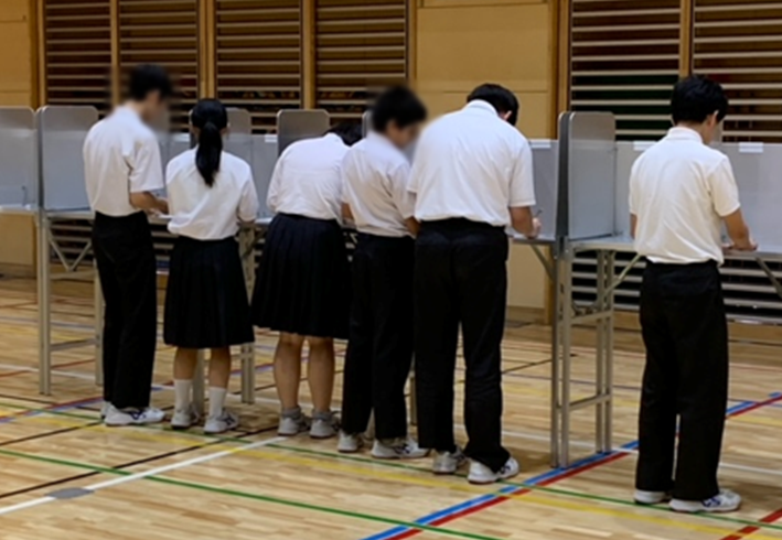 立会演説会後、生徒たちは、杉並区選挙管理委員会からお借りした投票箱を用い、本物の議員選挙と同じ方法等で投票を行いました。