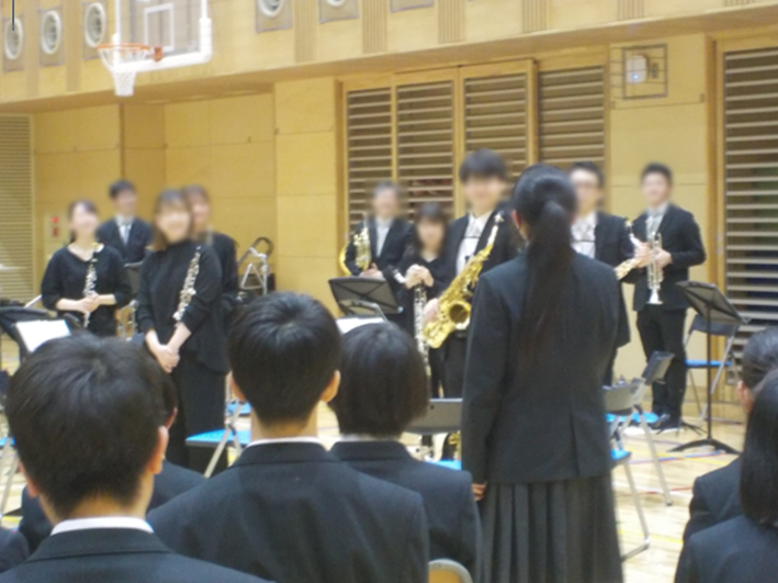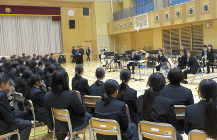 演奏曲は、ピョートル・チャイコフスキーの「くるみ割り人形」よりトレパック、アラン・メンケン作曲、ディズニー映画アラジンの楽曲「Friend Like Me」、ヴェルディ―作曲「アイーダ」より凱旋と勝利の大行進曲、ヴィットーリオ・モンティー作曲「チャルダッシュ」、モーリス・ラヴェル作曲「ボレロ」、ヨハン・シュトラウス1世作曲「ラデツキー行進曲」でした。どの曲も、オーケストラ鑑賞教室などで聴いたことのある生徒たちにとって馴染みのある曲でしたが、自分たちの5メートル程前で聴く生演奏は大迫力であること、細かく素早い指使い等が見て取れることなど、大感動の50分でした。また、ユーフォニアムの演奏世界一の濱岡雪乃さんから、超絶なテクニックのソロ演奏を聴かしていただくとともに、夢を実現するための秘訣などをお聞きすることもできました。芸人でもある指揮者の松元宏康氏の演奏や楽器についてのためになるお話も楽しく、たくさんの事を短時間で学ばせていただきました。