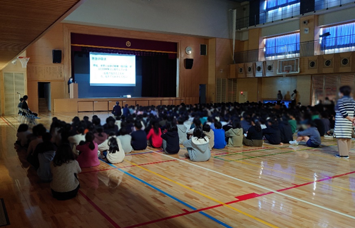 2024.12.23小学部朝会で中学生広島・海外派遣事業の報告会が行われました。