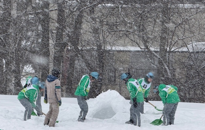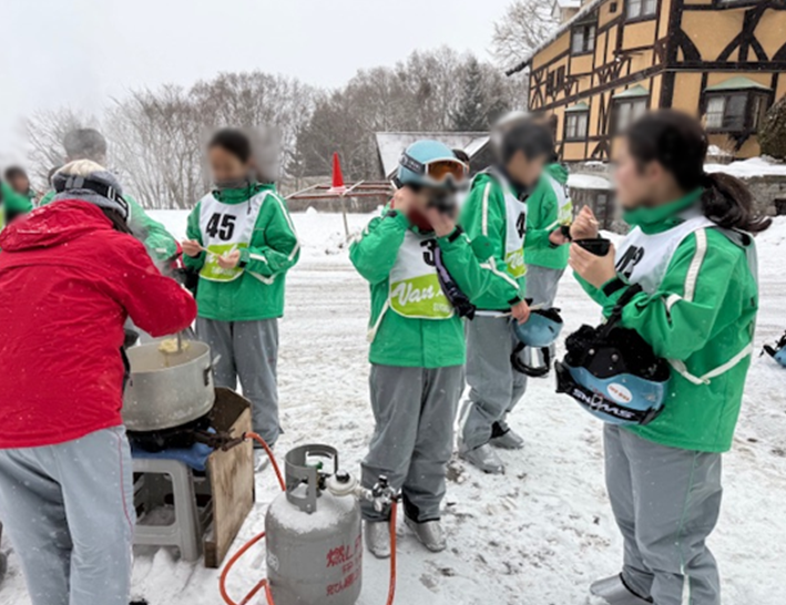 スキー場から宿舎に戻った後、雪の中で豚汁(生まれて1番、美味しい豚汁だったと言っていました。)をいただいた後、宿舎前でインストラクターの方と一緒に雪遊びをしました。今夜、雪遊びで作ったかまくらに宿舎の方が火を灯してくれることになっています。
