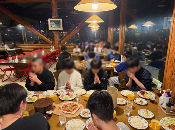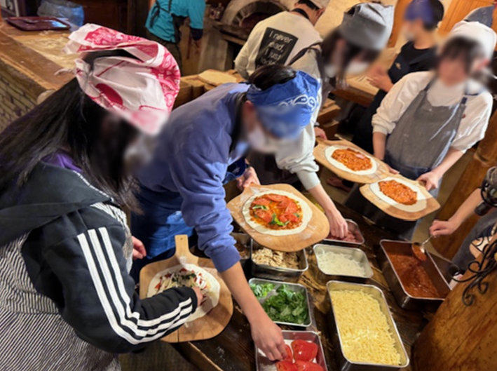 夕食は食事係が生地伸ばしたり、トッピングをしたりするなどして調理をしたピザを副菜として食べました。主食、主菜、副菜の品数が多く、皆、食べきれるかなと心配しましたが、どの班の食卓もほぼ完食でした。2時間ほど前に豚汁を食べた生徒とは思えないよい食べっぷりでした。