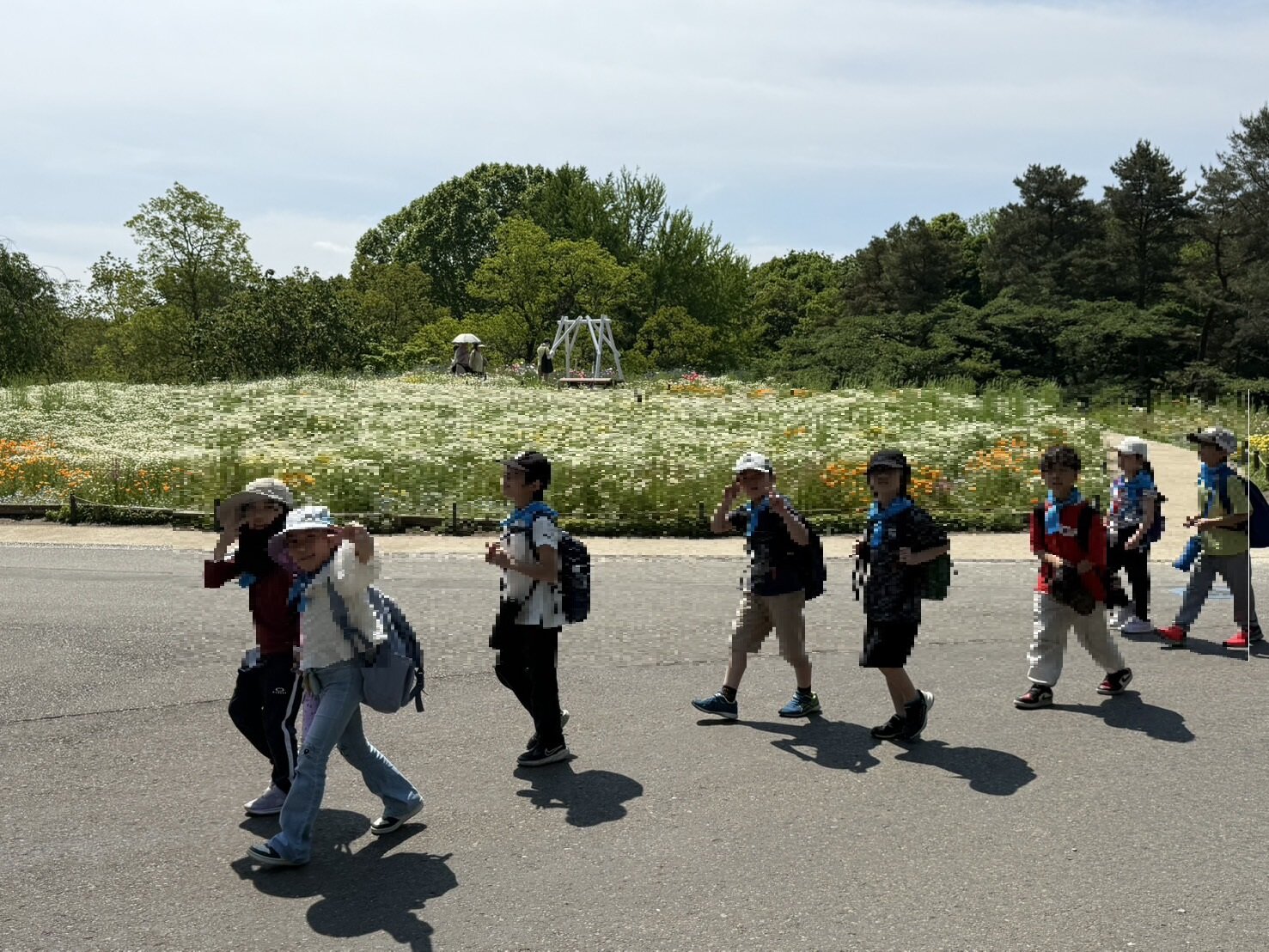 昭和記念公園に入ってからは、お花畑や鶯の鳴く林の中を列を乱さず歩き、まずは最初の目的地である「子どもの森」に行きました。解散したとたん様々な遊具まで一目散に走って行き、子供たちは夢中で遊んでいました。スケジュールは計画通りに進み、たっぷり遊んだ後は「みんなの原っぱ」まで移動し、昼食やおやつを食べました。