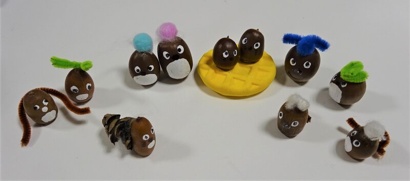 生活科見学で拾ってきたどんぐりに顔を描いたり、飾りを付けたりしてみました……