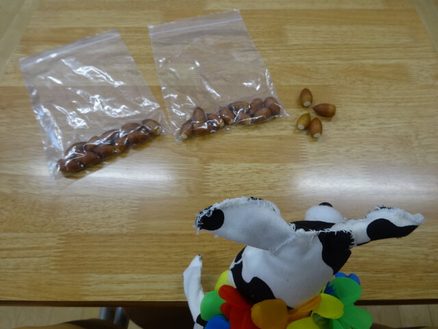 モーモーくんが、どんぐりを拾ってきたよ。 10のまとまりが2つと、4この……