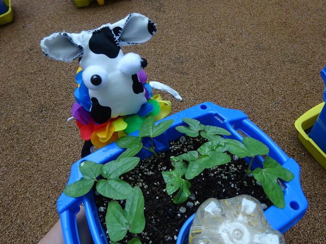 1年生がまいた種から、アサガオの芽が出ました。 小さな双葉を見て、子ども……