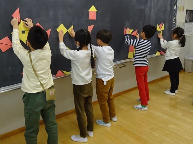 算数で「かたちづくり」の学習をしています。 三角形の色板を使って、いろい……
