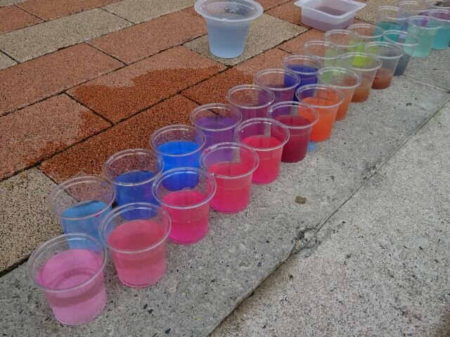 図工の時間、色水遊びに取り組みました。 赤、青、黄色の絵の具を使って、い……