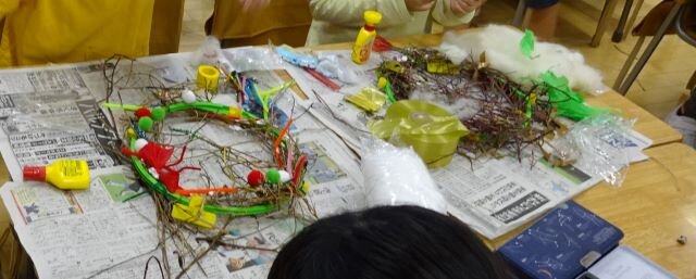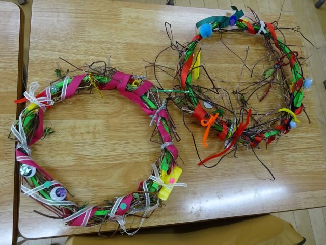 ツルを輪にして、リボンやモールで巻いたり、飾りを付けたりして・・・