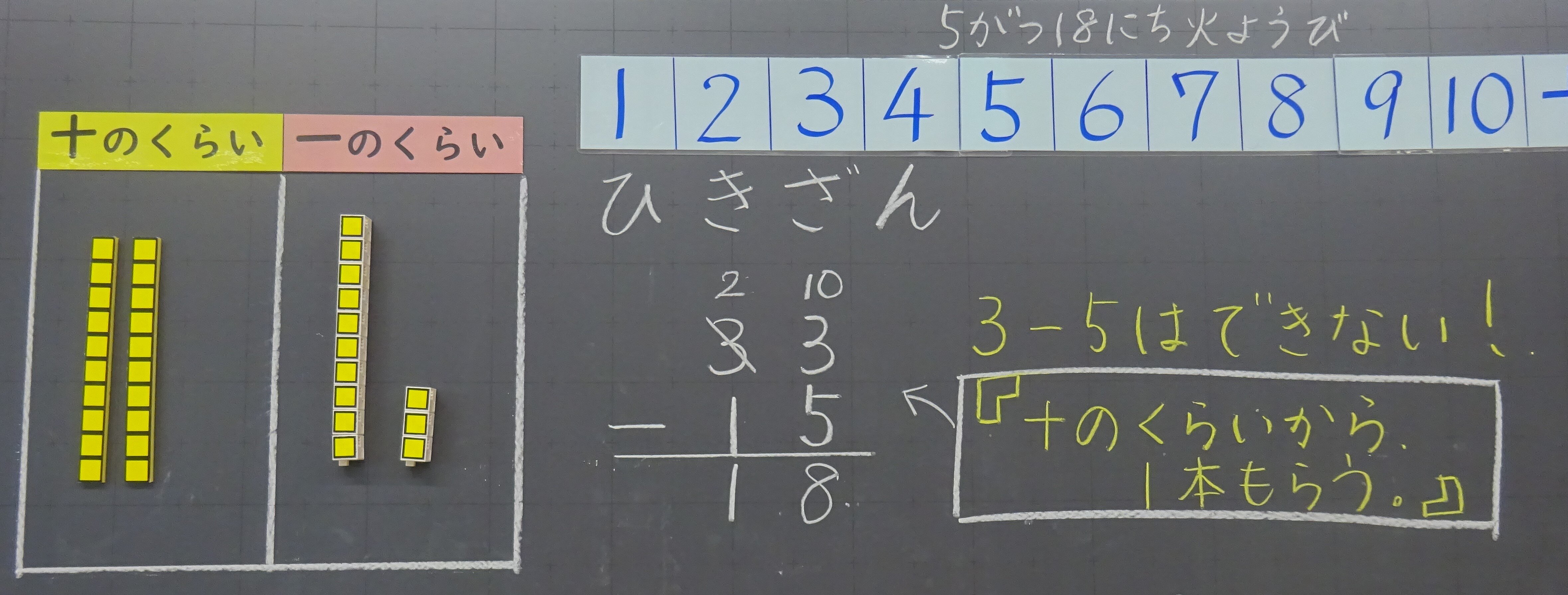 2学年算数「ひき算」 2021.05.18 算数では、繰り下がりのひき算の筆算を学習をしています。 (下の写真より)「一の位が3-5になってしまって、計算できない」 「どうしよう」 「十の位から10のまとまりを1本もらってくれば計算できるよ」 このような話合いやブロック操作を通して、繰り下がりのひき算の筆算を理解しています。 とても難しい学習ですが、あきらめずに一生懸命計算練習しています。 お子さんが宿題で困っていたら、声掛けをお願いします。