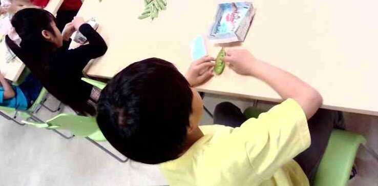 2学年給食で使うグリンピースをむこう 2024.05.10 生活科では、栄養士の建部先生と一緒にグリンピースのさやむきを体験しました。 「グリンピース好きな人?」建部先生の問いかけに半分くらいしか手が挙がりませんでしたが、むくときは、笑顔で楽しそうにむいていました。「さやえんどうが育つとグリンピースになります。」にびっくりしていた2年生でした。 自分たちがむいたグリンピースは、きっと苦手な人もおいしく食べられたのでは?何人かの子が「食べてみたらおいしかった!」と教えてくれました。