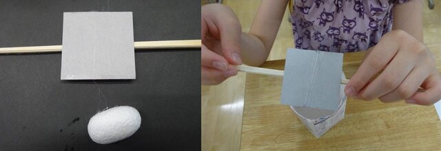 1辺5cmほどの厚紙に、割り箸を付けます。
