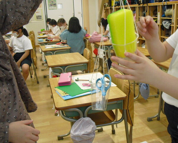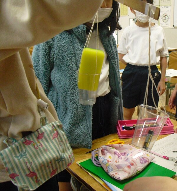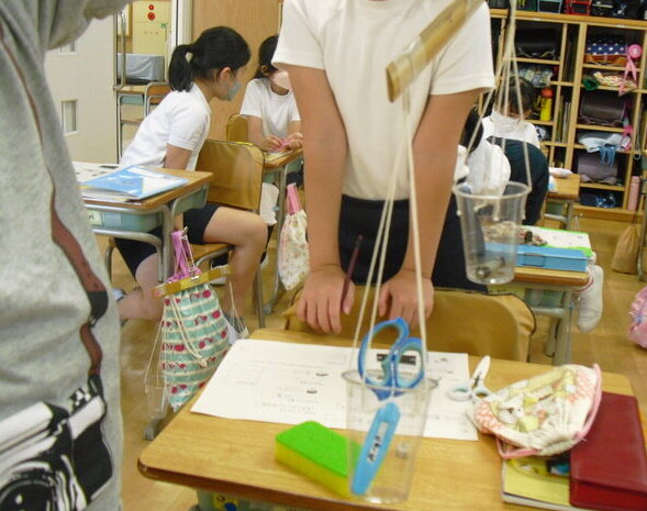 上皿天秤や、ものさしとプラカップで作った手作り天秤を使用して重さの比較をしました。