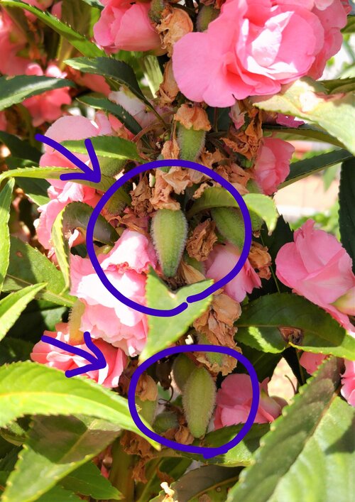 ホウセンカは、さらにたくさんの花をつけ、その下にある実が丸々としてきました。
