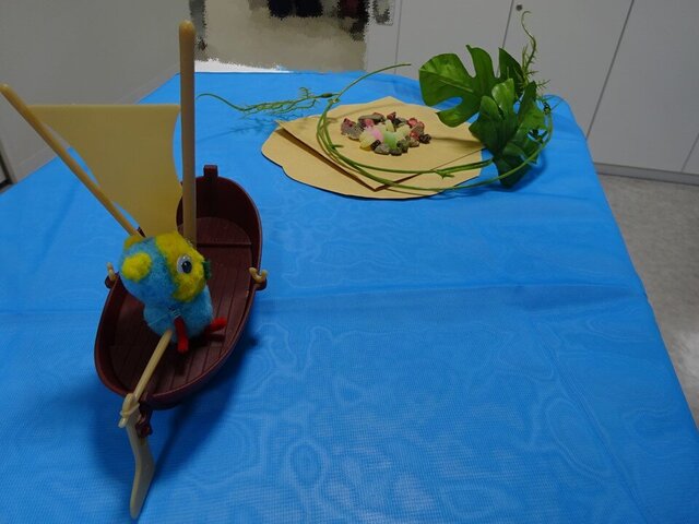 さんたろうは航海中、何かを見つけました。 あ!たからの島だよ! 上陸して……