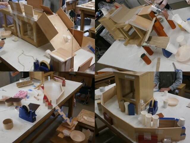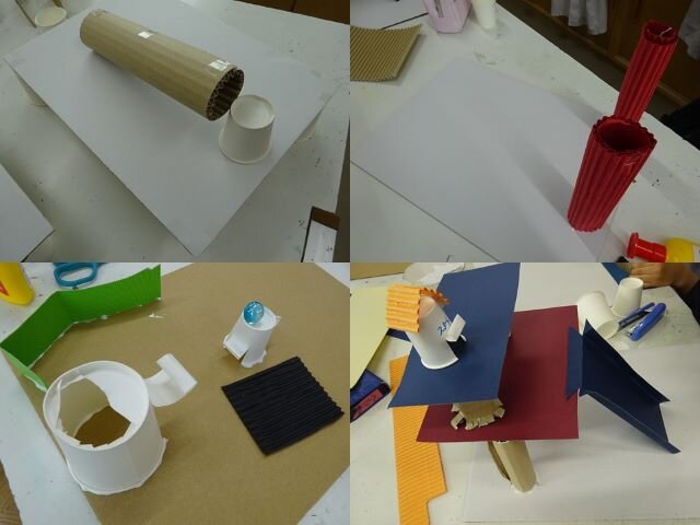 4学年ビー玉大ぼうけん 2023.04.14 4年生の図工は、「ビー玉大ぼうけん」でスタートです。 いろいろな材料を使って、ビー玉が転がるコースを作ります。 まずはグループで、机の上を大きく使ってコースを作りました。 図工室には、多種多様な材料が用意されています。 みんなイメージを膨らませ、ダイナミックなコースを作っていました。 この経験を基に、次は個人でコースを作ります。 個人で作るときはいろいろな「紙」を使いますが・・・ 工夫すると、楽しいコースができそうですね。 これから楽しみです。
