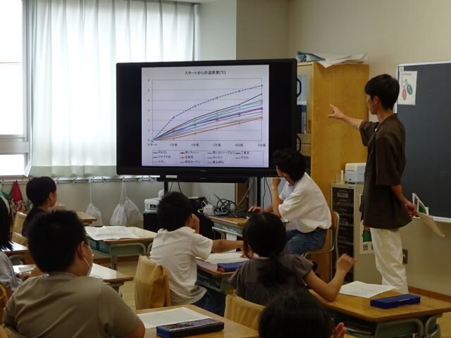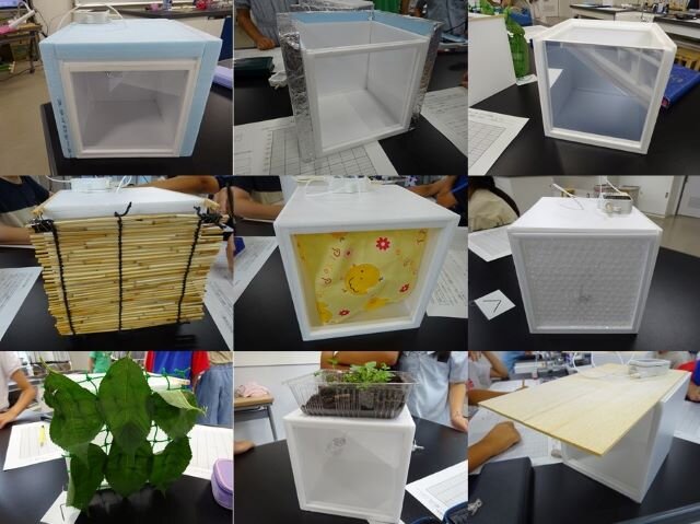 説明を聞いた後、どの実験箱が一番温まりにくいか=夏を涼しく過ごすことができるかを予想しました。
