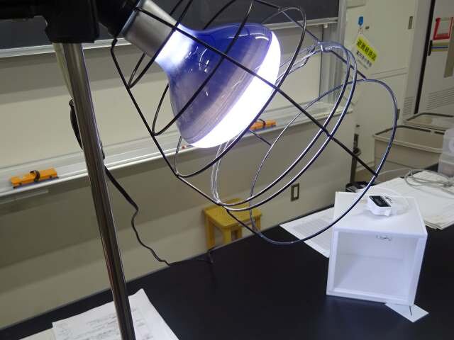 家に見立てた実験箱に、太陽の代わりにライトを当てて、温度の変化を調べます。