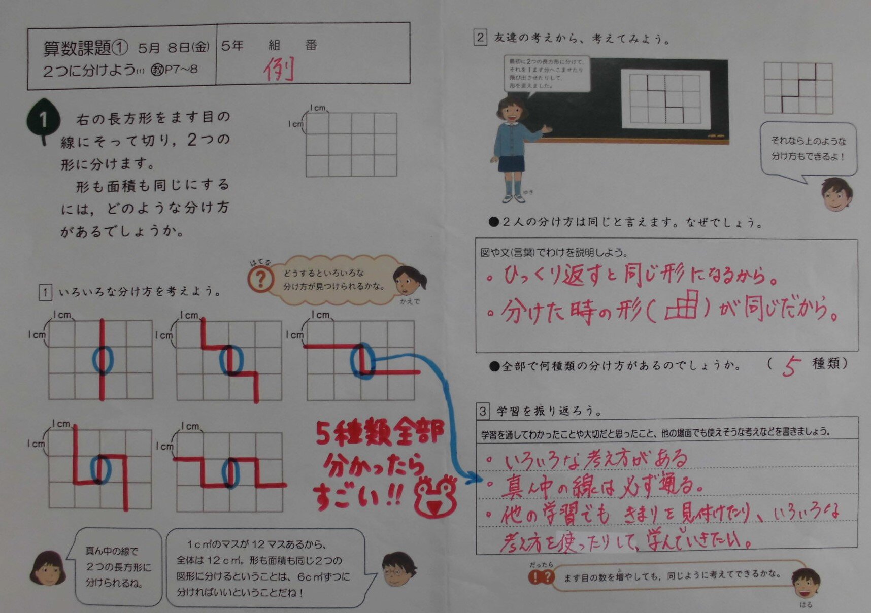 今週の算数の課題に「2つに分けよう」のプリントがありました。答えをアップするので、答え合わせをしたり、分からなかったところは確認したりしましょう。