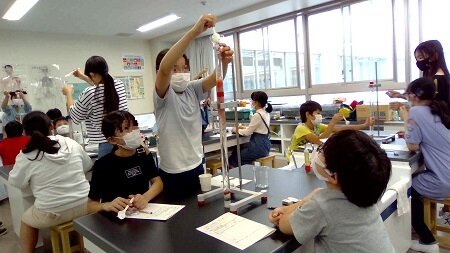 まずは、水の入ったアクリルパイプに粒の大きさの違う3種類の砂を混ぜたものを上から入れて、落ちる様子を観察しました。繰り返した4回とも、子供たちは砂の落ちる様子を食い入るように観察していました。