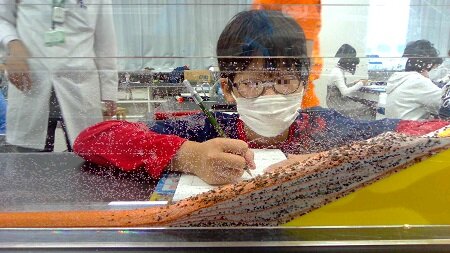 そのあとには、海とそこに流れ込む川の模型に土砂を流し、河口や海底での積もり方を観察しました。粒の大きさと落ちる順番はアクリルパイプの実験と同じでしたが、流れ込む土砂は海のどこまで届くのか、水槽の各場所を河口や海、海底に見立てて流れ込んだ時の積もり方をじっくり観察しました。