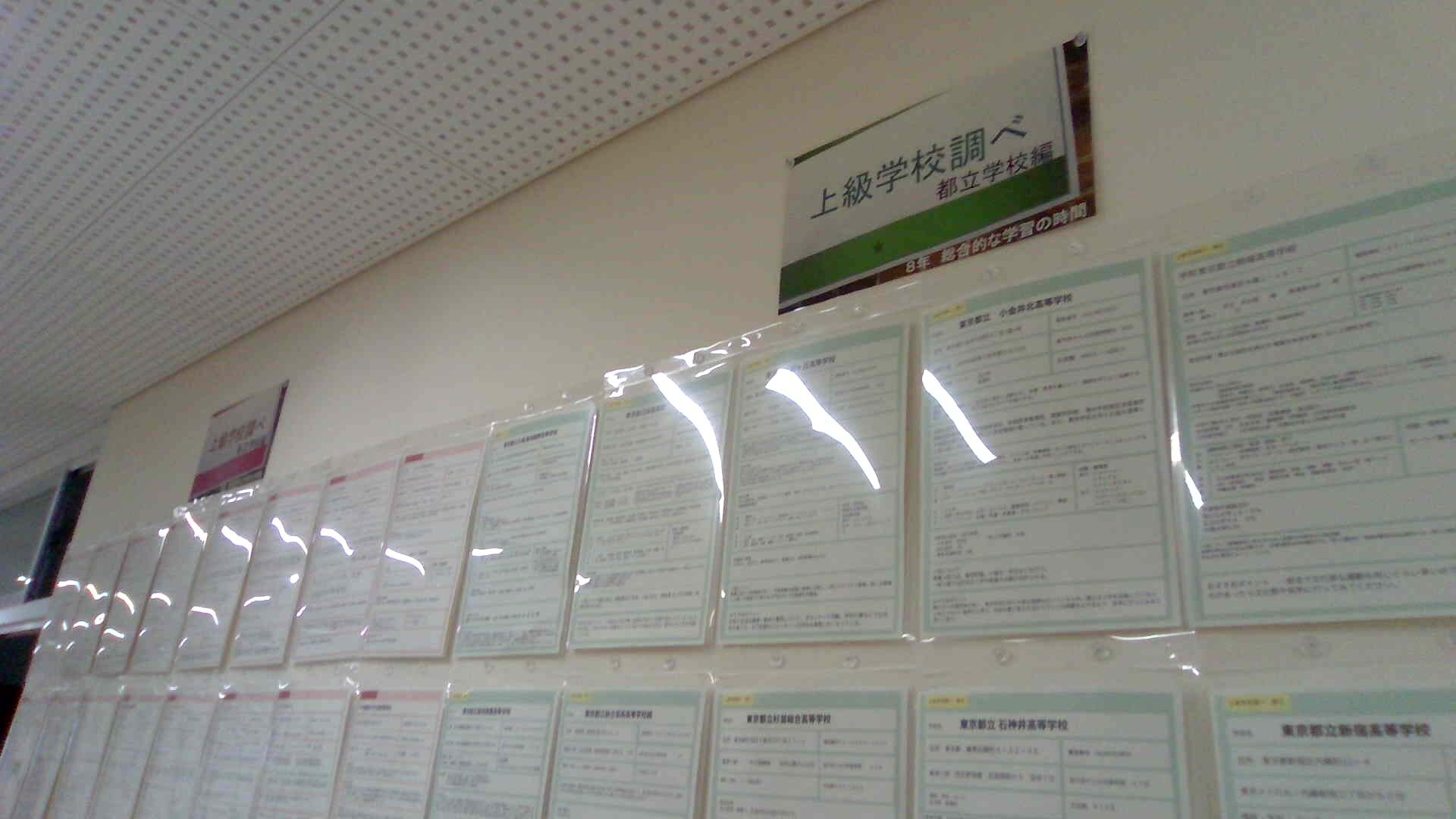 総合的な学習では、上級学校調べに取り組みました。担当する上級学校の決められた項目について調べ、おすすめポイントなども考えて作成しました。都立・私立・その他の学校合わせて56校分あり、8B前廊下に掲示していますので、進路学習に活かしてほしいと思います。