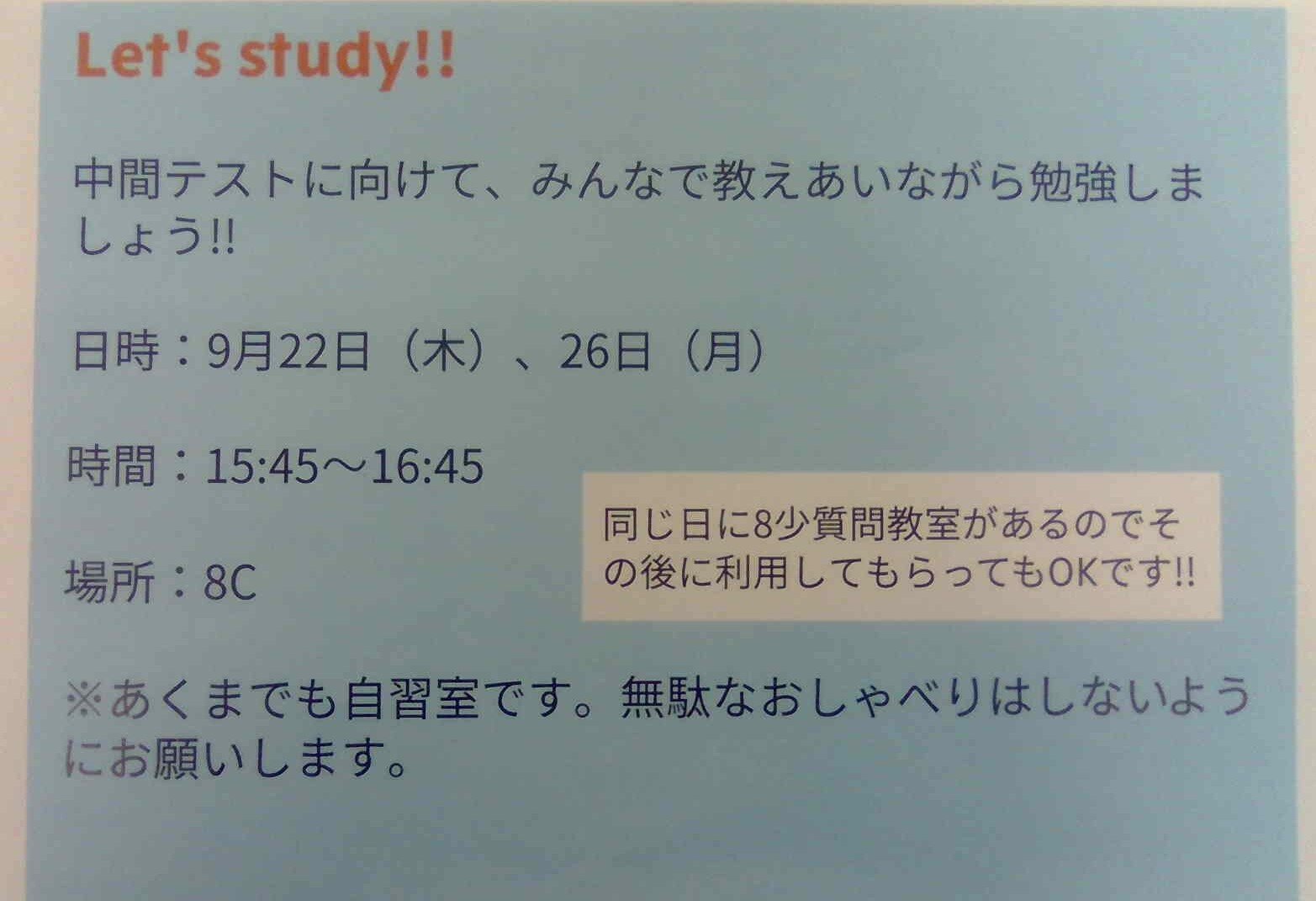 学校外の活動ですが、先日生徒全員に、水曜日の補習の講師の先生方による、学習教室のお知らせも配布しました。