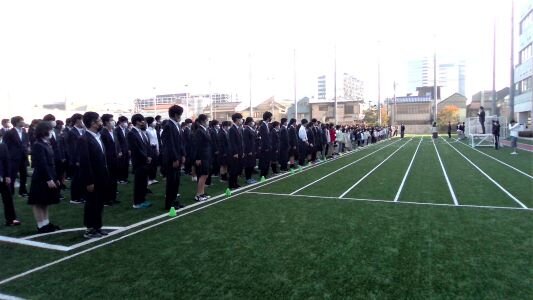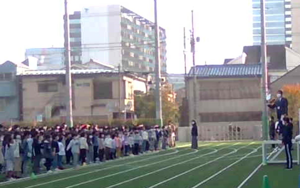 今朝は久しぶりに校庭に学園の全児童・生徒が集まって全校朝会を実施しました。
