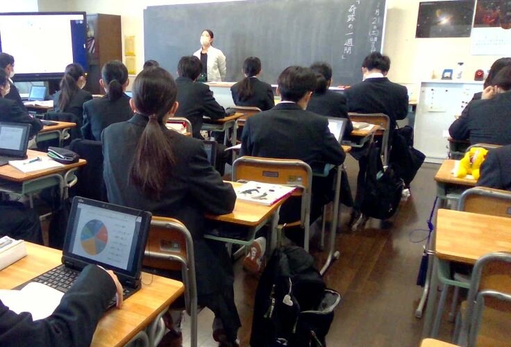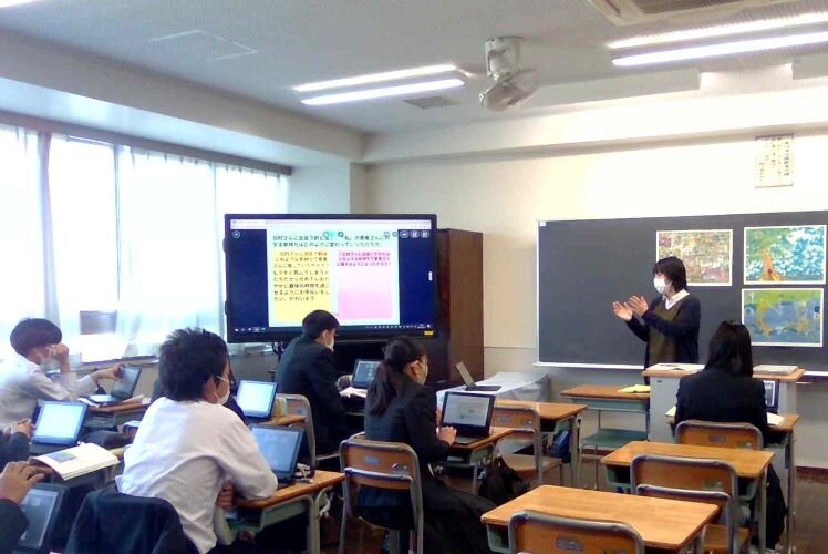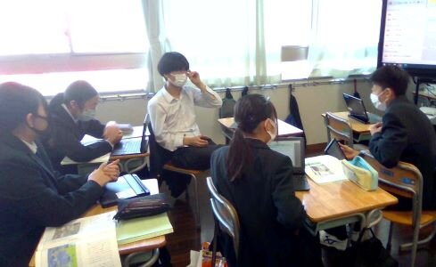 授業ではアンケートの結果を共有した後、資料を読みました。そして先生からのいくつかの発問について考え、ペアやグループで議論したり、ロイロノートで発表しました。