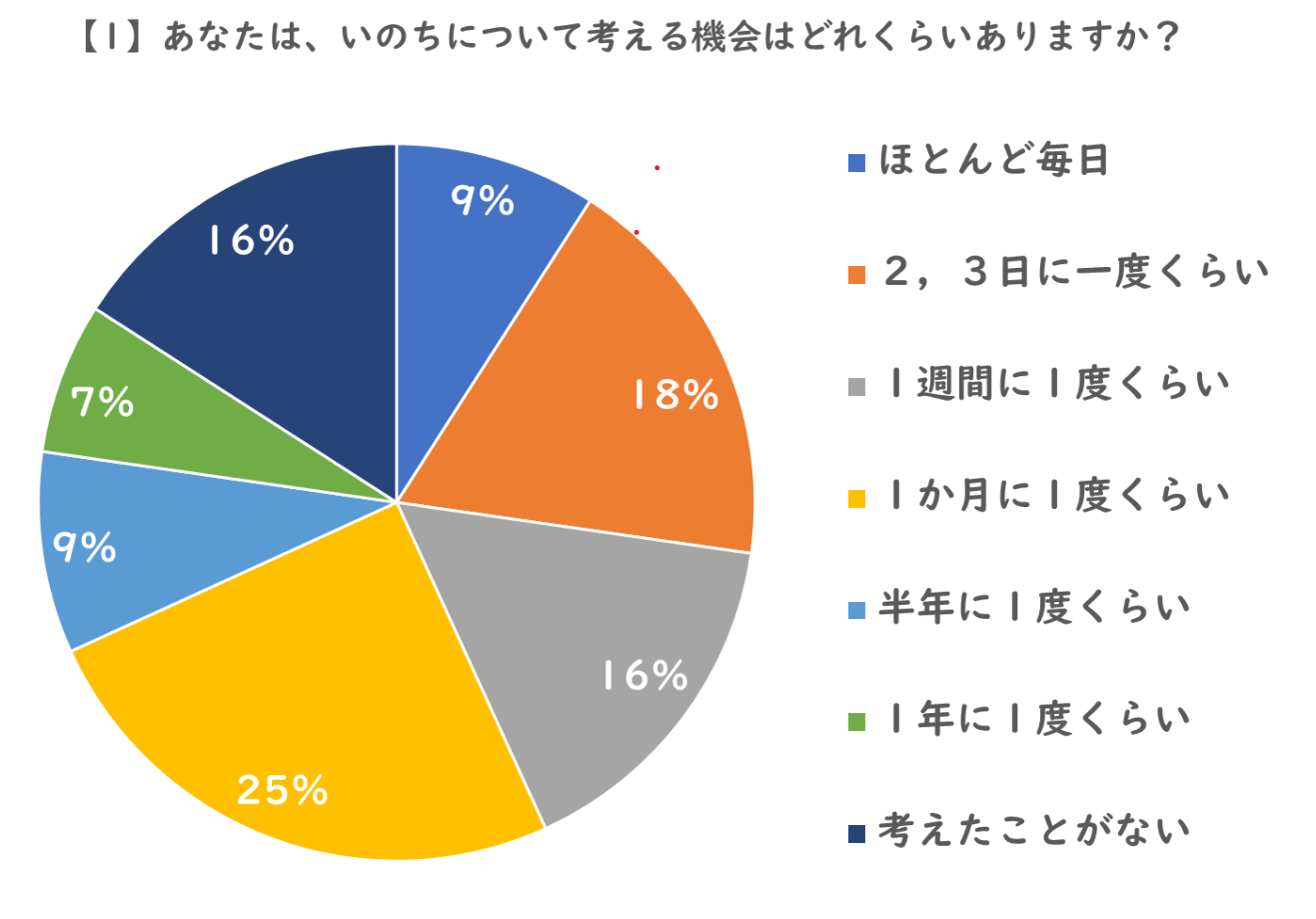 事前にいのちに関するアンケートを実施しました。いのちについて考える機会については、「毎日」という人から「1年に一度」、「考えたことがない」という人まで幅広い回答がありました。