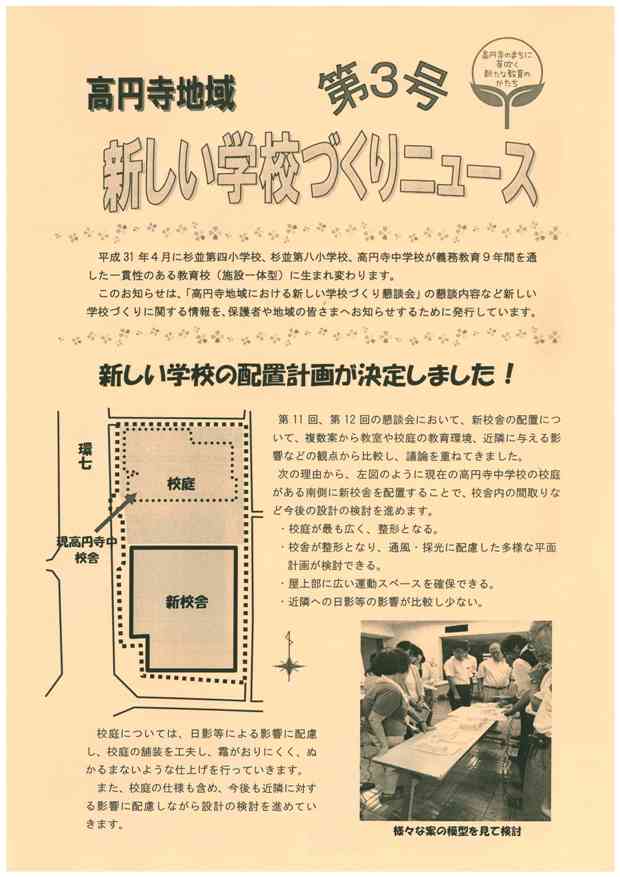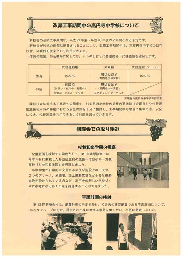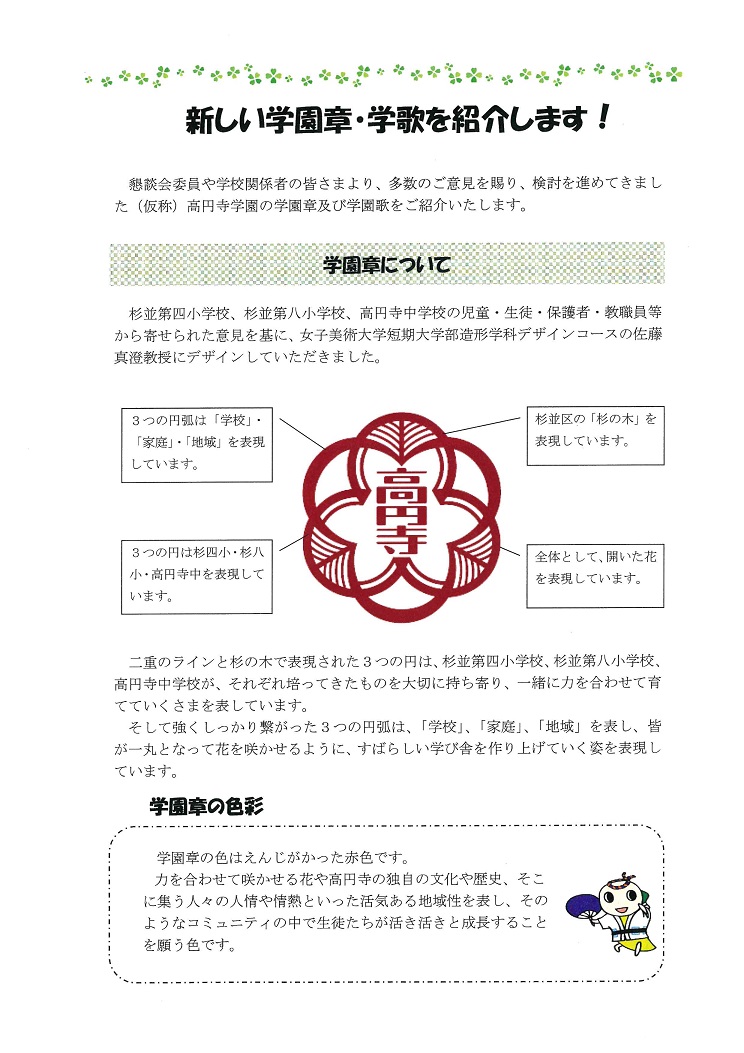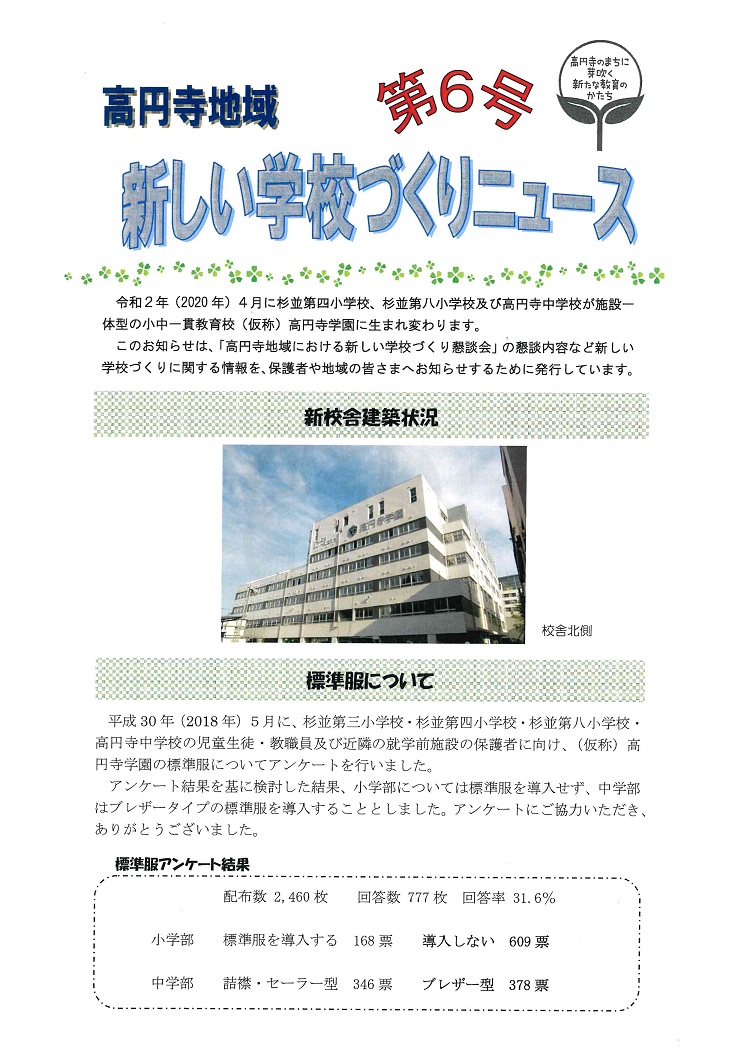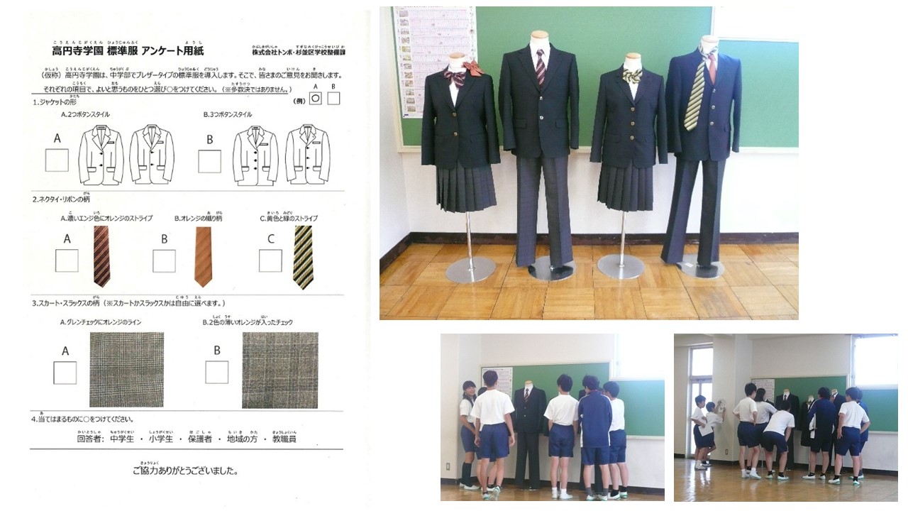 (仮称)高円寺学園中学部の標準服案が出来上がりました。5月の高円寺中運動会(杉四小開催)→杉四小→6月の杉八小運動会・杉八小→高円寺中 の予定で展示・アンケートを実施します。