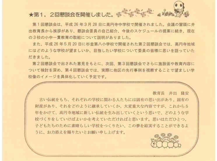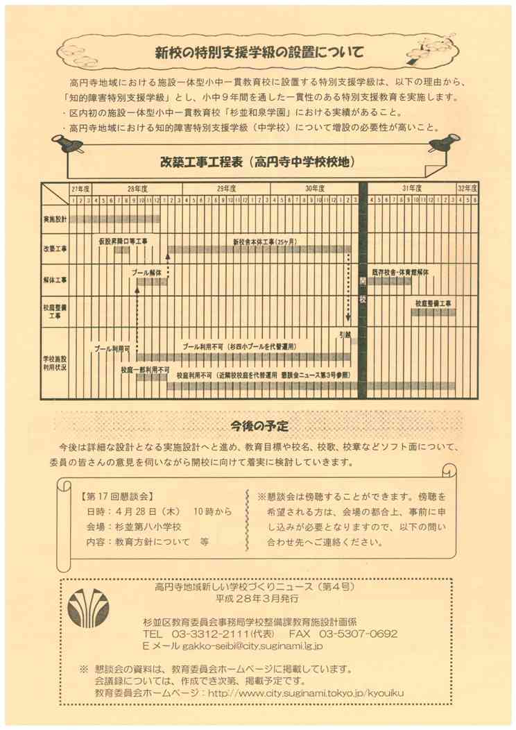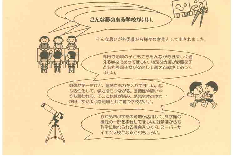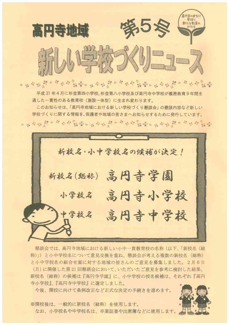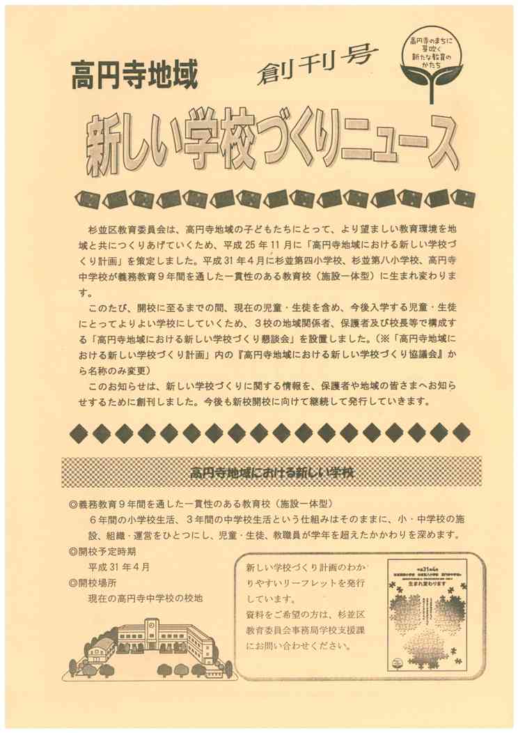(仮称)高円寺学園中学部の標準服案が出来上がりました。5月の高円寺中運動会(杉四小開催)→杉四小→6月の杉八小運動会・杉八小→高円寺中 の予定で展示・アンケートを実施します。