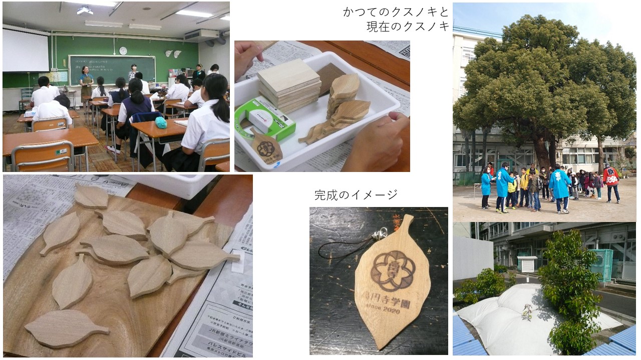 楠のモニュメントを制作してくださる女子美術大学の先生をお招きし、2年生でクスノキの葉をかたどったストラップを作りました。夏休みに美術部の生徒が女子美大を訪れ仕上げを行う予定です。