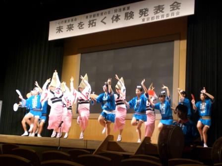 10月17日 東京都教育委員会が実施する「未来を拓く体験発表会」に代表として参加し、阿波踊り部のメンバーが踊りとこれまでの取り組みを披露しました。高齢者施設への訪問等の実績が認められました。