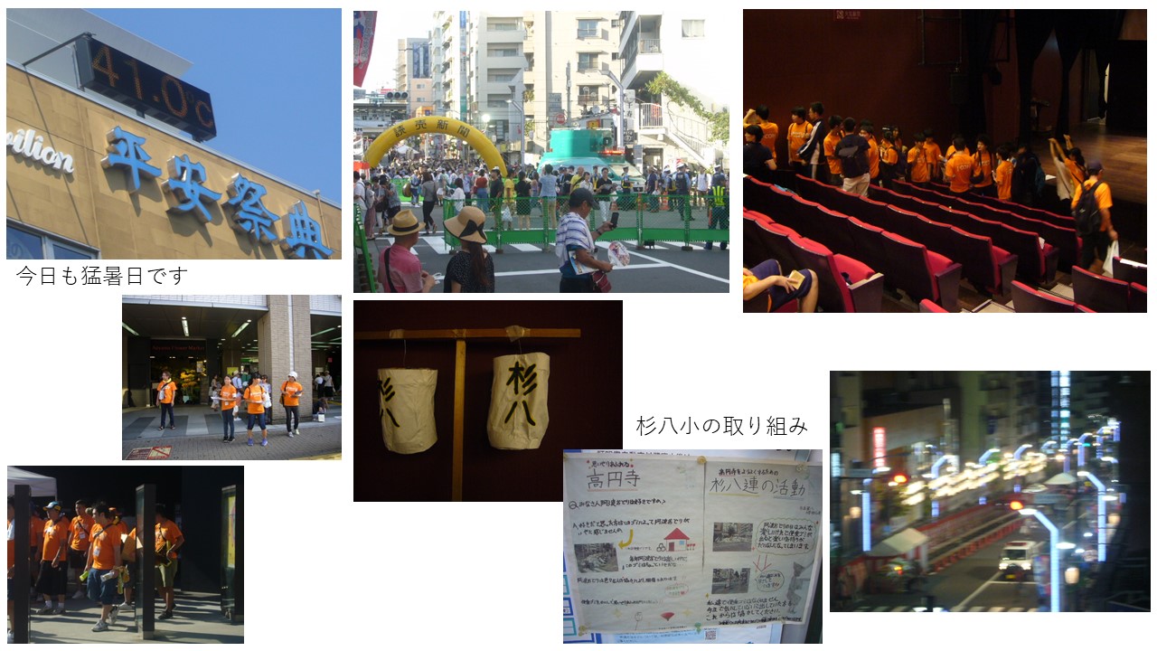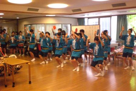 7月25日 去年に引き続き高齢者デイサービス施設「上井草ふれあいの家」を訪問し、踊りを披露し高齢者と懇談しました。中にはいっしょに踊ってくれる方もいて、たいへん盛り上がりました。阿波踊り部は、高円寺の「アースの森」、中野の「シルバーシティ哲学堂」にも訪問しました。
