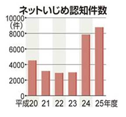 さらに、右のグラフのとおりネットいじめの認知件数も同じように増加しており、スマートフォン向けの無料アプリLINEを悪用したいじめも深刻化してきているようです。文部科学省が発表した、平成26年度の問題行動調査では、このネットいじめの件数が前年より1000件増え、8787件と過去最高になりました。各自治体ではネットパトロール等を行い、不適切な書き込みやネット上での誹謗中傷等のチェックや削除も行っていますが、LINEのような生徒同士の個別の通信を外部から確認するのは極めて難しいことですし、閉じた空間の中では「誹謗中傷」などにブレーキがかかりにくいことも事実です。さらに、「ネットでの悪口」や「相手のいやなこと」が何なのかをイメージすることができず、やりとりの当事者としての自覚も欠けがちになります。あたりまえのことですが、自分と相手の違いを理解し、自分自身が当事者であるという自覚をもち、コミュニケーションツールとしてのLINEなどで、大切な友達や仲間との質の高い、あたたかなコミュニケーションを作っていくために、いつでも相手のことを気遣い、その上で自分の気持ちを上手に伝えていく力を育てていってください。(橋本 剛)
